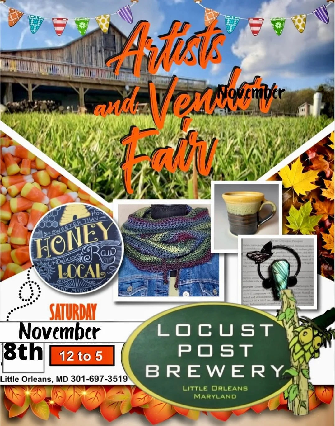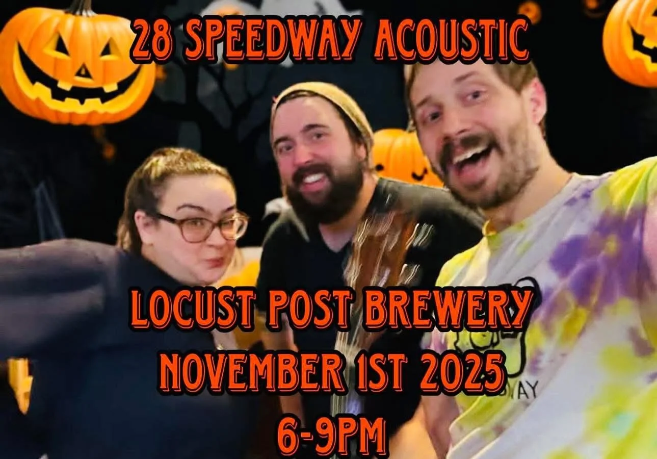 Two people in a brewery clinking glasses, wearing matching Locust Post Brewery shirts. Variety of beer glasses on a wooden table. Beer taps visible in the background.